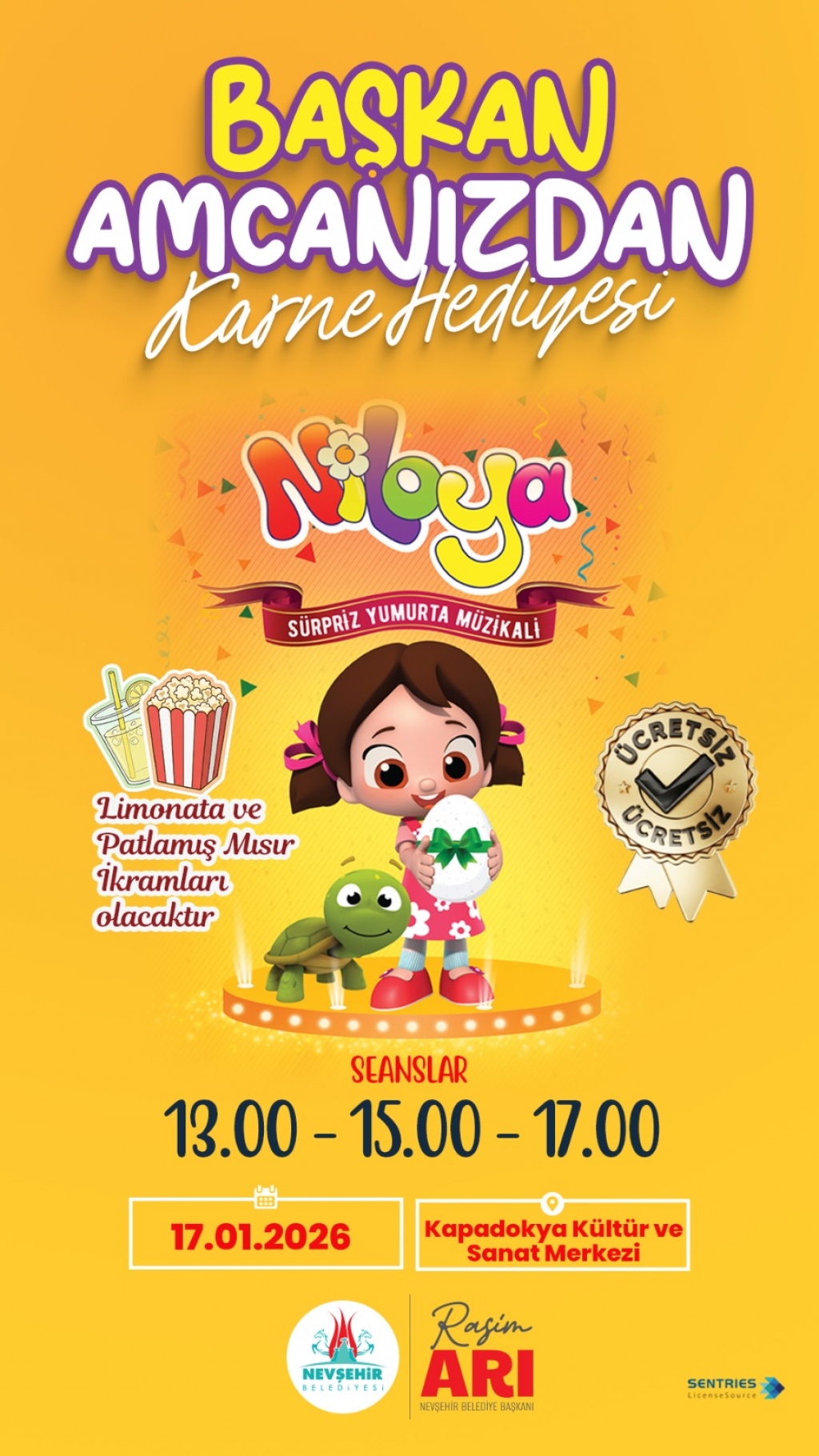 Nevşehir Belediyesi tarafından çocukların ara tatillerini dolu dolu geçirmeleri için 17 Ocak 2026 Cumartesi günü Kapadokya Kültür ve Sanat Merkezi'nde düzenlenecek Niloya Müzikali için tüm çocuklar ve aileleri davet edildi.