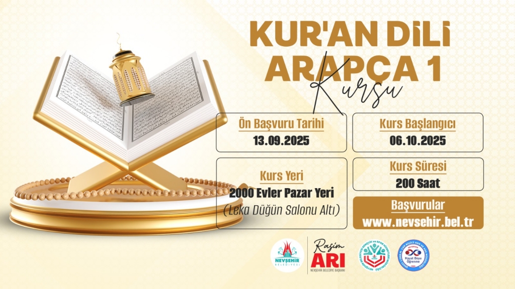 Kur’an Dili Arapça 1 Kursu; 13 Eylül 2025 tarihi itibariyle kurs kayıtları alınmaya başlayacak. Kurs 06 Ekim 2025 tarihinde başlayıp 24 Şubat 2026 tarihinde tamamlanacak. Kurs hafta içi her gün 15.00 - 17.00 saatleri arasında yapılacak. 20 kişi kontenjanla sınırlı olan kurs 2000 Evler Mahallesi pazar yerinde açılacak. Kontenjanlarla sınırlı kurslara katılmak isteyenler Paşa Konağı’ndaki Nevşehir Belediyesi Gençlik ve Spor Hizmetleri Müdürlüğü’ne şahsen başvurabilecekleri gibi, www.nevsehir.bel.tr adresindeki hızlı menü içerisinde bulunan KAPEM Kurs Kayıt sekmesinden online olarak kayıtlarını yaptırabilecek.