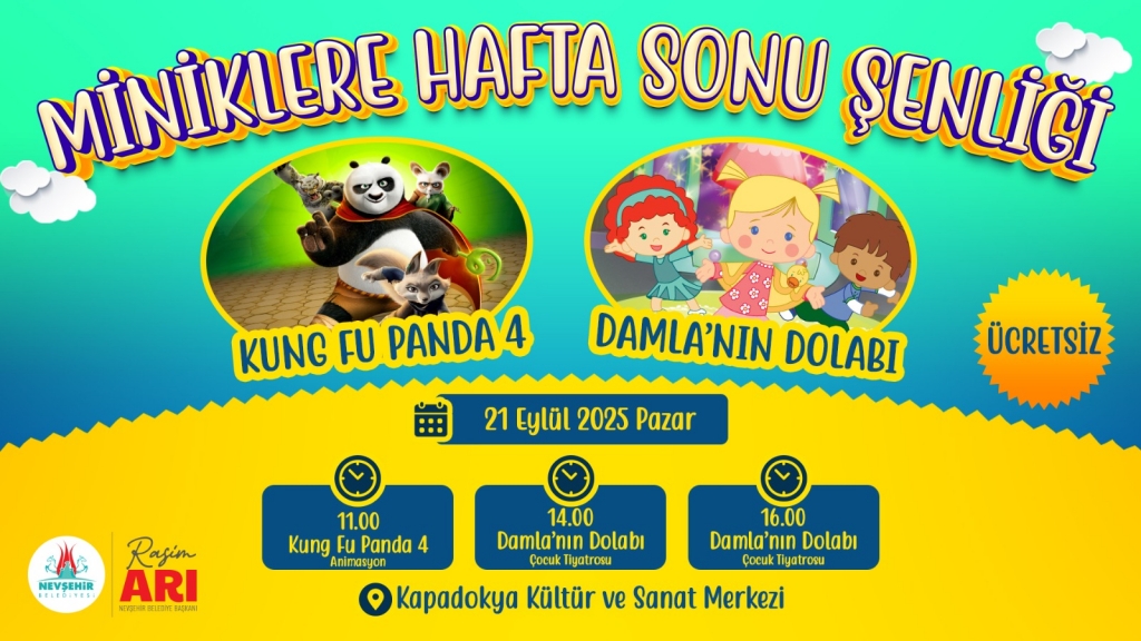 Diğer taraftan 21 Eylül 2025 Pazar günü YARIN, Kung Fu Panda 4 animasyon filmi saat 11.00’de, Damla’nın Dolabı Çocuk Tiyatrosu ise 14.00 ve 16.00 saatlerinde 2 seans olarak Nevşehirli çocuklarla buluşacak.
