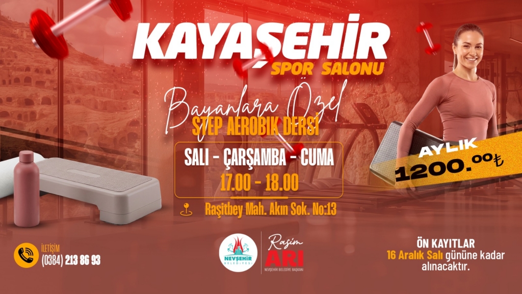Kayıtların şahsen ve telefonla alınmaya başladığı, her yaş aralığındaki bayanların katılabileceği Pilates dersi Salı, Çarşamba ve Cuma günleri 18.00 - 19.00 ve 19.00 – 20.00 saatleri arasında ve Step Aerobik dersi ise Salı, Çarşamba ve Cuma günleri 17.00 – 18.00 saatleri arasında Nevşehir Belediyesi Kayaşehir Spor Salonu’nda yapılacak ve ön kayıt başvuruları 16 Kasım 2025 Salı gününe kadar alınacak.
