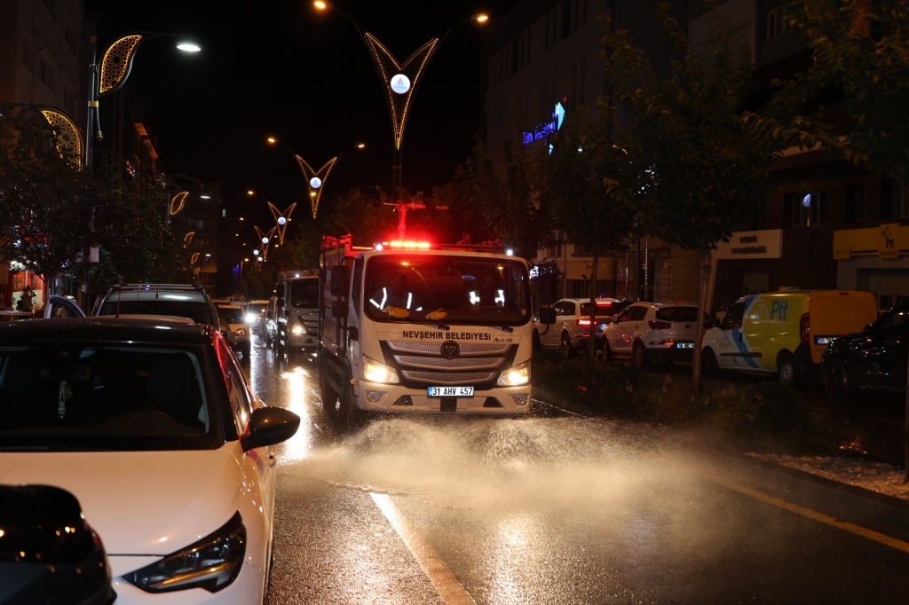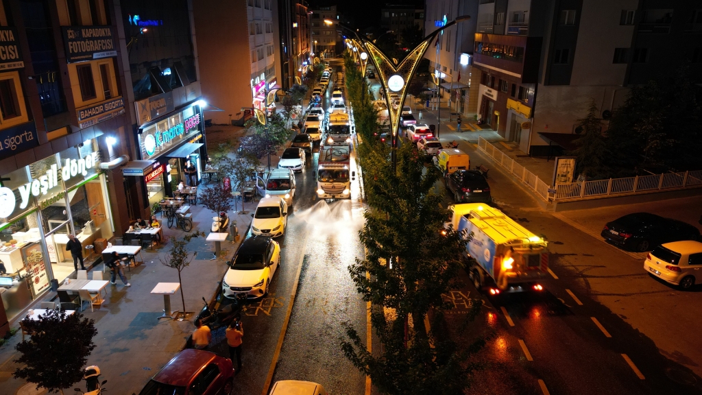 Nevşehir Belediyesi tarafından Kurban Bayramı öncesinde mahallelerde gerçekleştirilen temizlik çalışmalarının son gününde belediye ekipleri bugün cadde ve sokakları yıkadı. Yıkanan cadde ve sokaklara daha sonra drone ile gül suyu sıkıldı.